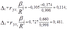 Анализ бета и дельта-коэффициентов показывает, что на объем реализации продукции наибольшее влияние из двух исследуемых факторов оказывает фактор х2 — цена продукции, так как фактору соответствуют наибольшие (по абсолютной величине) значения коэффициентов.