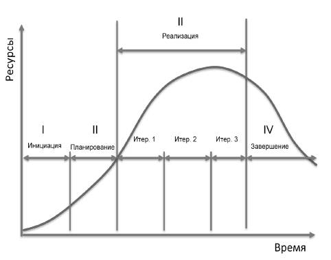 Проект часто начинается с идеи, которая появляется у одного человека. Постепенно, по мере формулирования, анализа и оценки этой идеи, привлекаются дополнительные специалисты. Еще больше участников требуется на фазе планирования проекта. Пик потребления ресурсов приходится на фазу реализации.