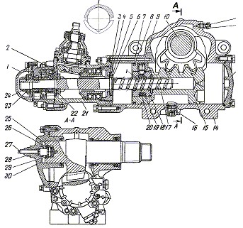 1 – передняя крышка; 2 – распределитель рулевого усилителя; 3, 29 – упорные кольца; 4 – плавающая втулка; 5, 7 – уплотнительные кольца; 6, 8 – распорные кольца; 9 – установочный винт; 10 – вал сошки; 11 – перепускной клапан; 12 – защитный колпачок; 13 – задняя крышка; 14 – картер рулевого механизма; 15 – поршень-рейка; 16 – магнитная пробка; 17 – винт; 18 – шариковая гайка; 19 – желоб; 20 – шарик; 21 – рулевая передача; 22 – упорный роликовый подшипник; 23 – пружинная шайба; 24 – гайка; 25 – упорная шайба; 26 – регулировочная шайба; 27 – регулировочный винт; 28 – контргайка регулировочного винта; 30 – боковая крышка
