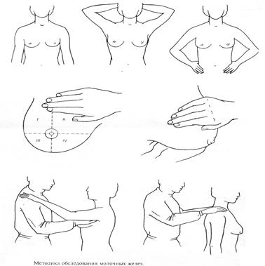 Методика самообследования молочных желез. Для раннего выявления предопухолевых изменений и опухолей молочных желез всем женщинам старше 25 лет следует рекомендовать самим следить за состоянием молочных желез, т. е. научиться приемам самообследования, которое следует проводить в любой день 1-й недели после каждого менструального цикла.