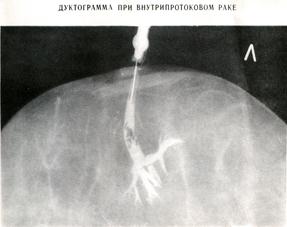 Дуктография молочной железы (рис.4) — рентгенографическое исследование протоков молочной железы после введения в них контрастного вещества с последующим проведением маммографии. Дуктография помогает проводить дифференциальную диагностику между доброкачественными новообразованиями и раком молочной железы. Показанием являются выделения из сосков. Область ареолы и соска обрабатывают спиртом. По капле секрета отыскивают наружное отверстие сецернирующего млечного протока. В него на глубину 5 — 8 мм. вводят тонкую иглу с тупым концом. Через иглу под небольшим давлением в проток вводят 0,3—1 мл. 60% раствора верографина или урографина до появления чувства небольшого распирания или легкой болезненности. Анализ снимков позволяет сулить о форме, очертаниях, дефектах наполнения протоков.