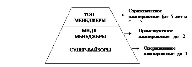 1) стратегическое управление (включает выработку целей менеджмента, а также перспективное планирование);