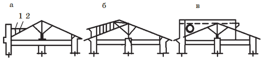 Преобразование висячей системы в наклонную. В процессе многолетней эксплуатации ослабляются узловые соединения стропильной системы, что приводит к возникновению значительного распора в карнизной части наружных стен, и при потере шарнирной связи балок чердачного перекрытия с наружными стенами происходит разрушение стен. При капитальном ремонте дома с сохранением перекрытий большепролетные перекрытия разгружают вновь вводимой разгружающей системой, состоящей из стальных колонн или кирпичных столбов, которую одновременно используют и для преобразования стропильной системы.