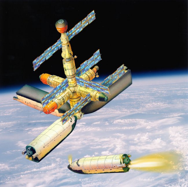 Тот же базовый модуль, как на орбитальной станции "Мир", те те боковые (уже не секрет, что на "Спектре", например, предполагались испытания оптической системы обнаружения ракетных пусков. А стабилизированная платформа с теле- и фотокамерами на "Кристалле" - чем не прицел?), но вместо астрофизического "Кванта" - модуль с комплексом боевого управления. Под "шариком" переходного отсека - еще один переходник, на котором висят четыре модуля (на основе "бурановского" фюзеляжа) с боевыми блоками. Это, так сказать, "исходное положение". По тревоге они отделяются и расходятся на рабочие орбиты, выбираемые из следующего соображения: чтобы каждый блок вышел на свою цель в тот момент, когда над ней будет пролетать центр управления.
