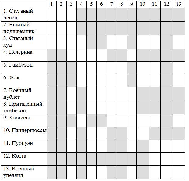 Кроме того, согласно [1], разделяя по применению, можно определить три типа стеганой нательной военной одежды конца XIV века.