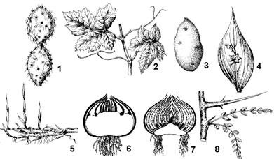 1 — стеблевой суккулент; 2 — усик; 3 — клубень; 4 — филлокладия; 5 — корневище; 6 — клубнелуковица; 7 — луковица; 8 — колючка.