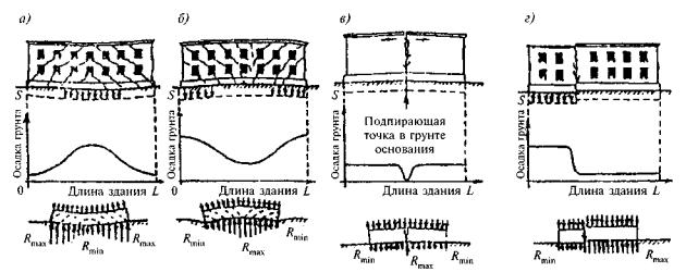 а - осадка средней части здания; б - осадка крайних частей здания; в - разлом здания; г - просадка части здания; R -сопротивление грунта основания