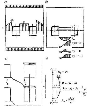 На рис. 2.13 приведена схема распределения нормальных и касательных напряжений в кирпичной кладке,моделируемой пластиной с прямоугольными отверстиями. При равномерно распределенной нагрузке максимальные нормальные напряжения концентрируются на границе отверстий, а касательные - в простенках. Примерное соотношение напряжений приведено на эпюрах по характерным сечениям.