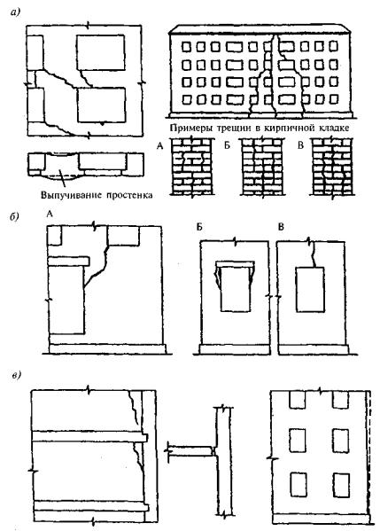 а - вертикальные трещины в простенках; б -то же, в зоне заделки перемычек; в - деформации внутренних стен в местах примыкания к наружным стенам