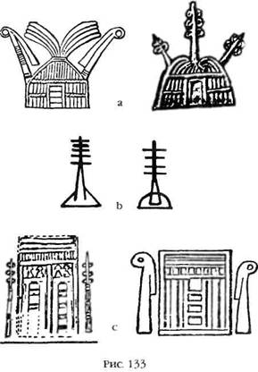 На древних шумерских рисунках часто встречаются массивные сооружения, строившиеся сначала из тростника и дерева и располагавшиеся в полях среди пасущегося скота. С распространенным мнением, что это были навесы для скота, никак не вяжутся колонны, установленные на крыше таких построек (рис. 133 а).