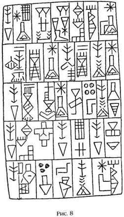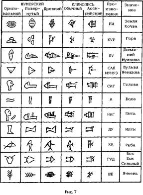 Без этих древних словарей мы и сегодня были бы весьма далеки от расшифровки шумерских текстов, а с их помощью для нас открылись настоящие сокровища литературы и культуры в целом. Кроме того, выяснилось, что изначально шумерская письменность была пиктографической и значки вырезались на камне в виде вертикальных колонок; впоследствии символы стилизовали для удобства выдавливания на мягких глиняных табличках, в результате чего возникла клинопись, принятая впоследствии аккадцами, вавилонянами, ассирийцами и другими народами Ближнего Востока (рис. 7).