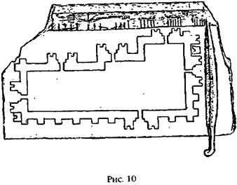 Гудеа, живший за двенадцать веков до Моисея, утверждал то же самое. Данные ему в видении инструкции он записал в виде длинного повествования. Ему явился «человек, сияющий, как небеса», стоящий рядом с «божественной птицей», и приказал построить храм. Этот «человек» («…по венцу на главе его, он – бог!») в действительности оказался богом Нингирсу. С ним была богиня, в одной руке державшая «табличку звезд доброго неба», а в другой – «священное стило», которым она указала Гудеа «покровительствующую планету». В руках третьего бога была таблица из драгоценного камня – «и начертан там был вид храма». На одной из статуй Гудеа изображен сидящим с табличкой на коленях; на этой табличке явственно различим божественный чертеж (рис. 10).