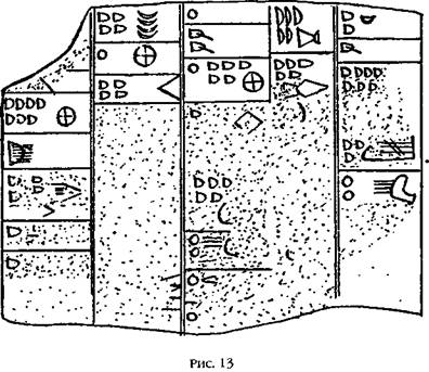 Шумерская система счисления, называемая шестидесятиричной, была получена объединением «земного» числа 10 с «божественным» числом 6, в результате чего получилось основание 60. Эта система в некоторых отношениях совершеннее нашей, десятичной, и в любом случае она превосходит греческую и римскую. Она позволяла шумерам находить дроби и умножать миллионы, вычислять корни и возводить в степень. Это была не только первая из известных нам систем счисления; в ней впервые использовалось понятие разрядов: как и в десятичной системе, где цифра 2 в зависимости от положения может обозначать 2, 20 или 200, в шумерской системе цифра 2 могла обозначать 2, 120 (2 х 60) и так далее – в соответствии с ее «разрядом» (рис. 13).