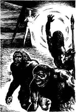 Тем временем, к их общему удивлению, драги попрятались в лесах. Они, должно быть, сочли чужой корабль новым чудом техники моков, может быть, даже каким-то необычным вызовом. Затем, размахивая дубинками и бросая копья, они выбежали из чащи леса на освещенное место, напрасно пытаясь пробудить чудовище к жизни. При этом они раздавили убегавших моков, просто не заметив их.