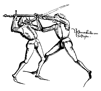 | Лист 58 Nach dem Mordstreich weglaufen, stossen dann wieder schlagen und reissen (mit der Parierstange). После торможения смертельного удара ударить снова и рвануть (крестовиной) Должно быть, здесь подразумевается обман смертельным ударом посредством оттягивания его назад и нанесения повторного удара, цепляя за шею сзади, чтобы потом рвануть крестовиной. В этом случае финт похож на ложный вертикальный удар сверху с последующим уколом и/или подрезкой. |