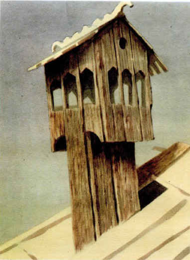 Чертеж деревянного здания той же башни и на том же участке, но при пасмурном освещении дает другой пример графической передачи в цвете типичного серого колорита дерева в постройке при том же масштабе изображения (рис. 98). В этом случае работа также начинается с нанесения небесного фона по всей плоскости чертежа. Затем наносится серовато-розоватый цвет дерева, встречающийся при пасмурном освещении. По нему прокладывают серые полутона, тени и, наконец, рефлексы. Рефлексы покрывают едва заметно вверху и в большей мере внизу, особенно там, где архитектурные детали приближаются к отраженному свету от наземных предметов (рис. 98).