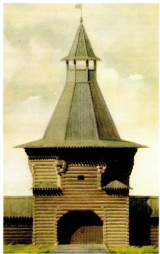 Деревянное сооружение на фоне неба темнее своего фона. Его цвет может перекрыть цвет фона. Поэтому покраску проекции деревянного здания можно в этом случае начинать с общего нанесения фона, которым покрывают и самое сооружение. По законченному фону, т. е. поверх цвета неба, наносят цвет деревянного сооружения, освещенного солнцем. В данном случае это будет светлый серовато-золотистый тон, который хорошо заметен на левой грани восьмерика башни и на торцах бревен (рис. 97). Затем наносятся более темный холодный серый полутон и еще более темные падающие и собственные тени. На поверхностях архитектурных деталей, обращенных к земле, наносятся рефлексы. На пристройках рефлексы от травы будут зеленовато-коричневые, под крышей башни — просто коричневые, на верхнем ярусе башни — едва заметные, с более холодными оттенками.