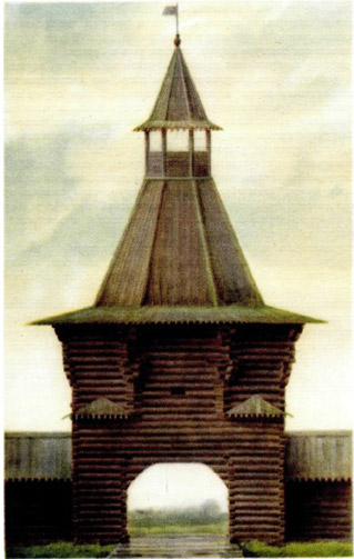 Рис. 97. Деревянная архитектура при солнечном освещении. Прямой солнечный свет создает резкую светотень, выявляет рельеф бревенчатой архитектуры, дает теплые блики. Облачный небосвод определяет холодные полутона и тени. Трава придает рефлексам зеленоватый оттенок.