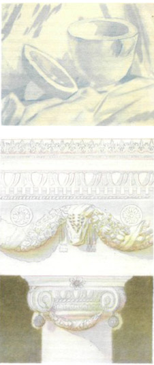 В жанровых и архитектурных акварелях, требующих более точного, сложного и детального контура, целесообразно применять карандаш. В сером карандашном контуре имеют значение светлота тона и тонкость очертаний. Законченный в карандаше вспомогательный контур должен представлять собой легкую, едва заметную серебристую паутину. Причем в освещенных местах, где будут положены светлые краски, он наносится легко, иногда прерывисто по зерну бумаги, а в глубоких тенях твердо прочерчивается, чтобы линии оставались видимыми под темными красками более длительный срок (рис. 45).