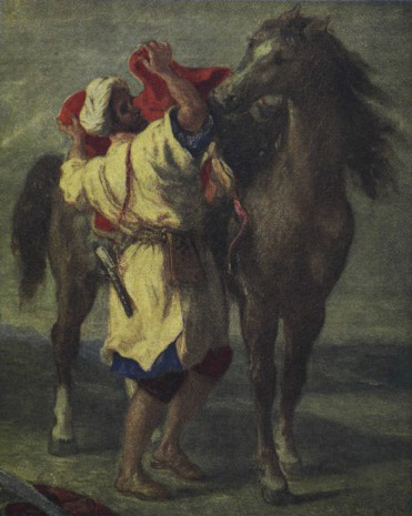 Рис. 30. Гармонический строй красок. Фрагмент картины Э. Делакруа «Марокканец, седлающий коня». Противопоставлению четырех дополнительных цветов сопутствуют определенные соотношения их по площади и насыщенности; насыщенность обратно пропорциональна площади.