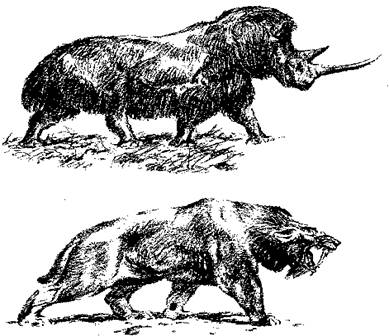 РИСУНОК 60. Вымершие представители мамонтовой фауны: (а) - шерстистый носорог, (б) - гигантская саблезубая кошка смилодон.