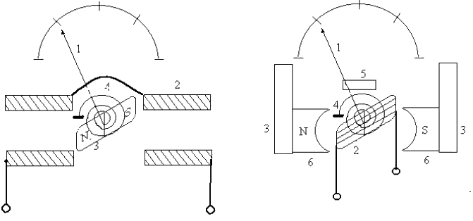 На рисунке а показана схема магнитоэлектрического механизма с подвижным магнитом, а на рисунке б- с неподвижным магнитом.