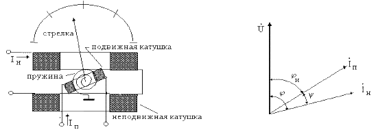 Устройство электродинамического механизма и векторная диаграмма, поясняющая его работу, приведены на рисунке: