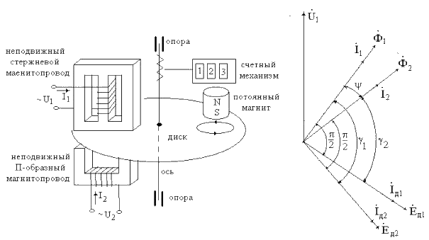 На основе индукционного измерительного механизма выполняются, как правило, счетчики электрической энергии. Устройство и векторная диаграмма прибора индукционной системы показаны на рисунке: