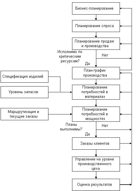 Обычно MRPII применяется на производственных предприятиях, в чисто коммерческих предприятиях аналогичную функцию выполняют системы DRP (планирование ресурсов для управления коммерческой деятельностью). В общем виде система управления предприятием, построенная в соответствии со стандартом MRPII, имеет следующий вид (рисунок 7.2):