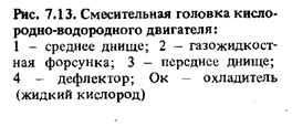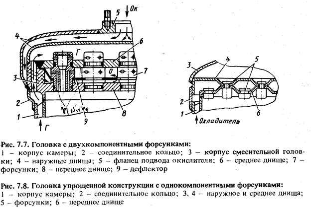 В корпусе этой головки, как показано на рис. 7.7, сделаны перекрещивающиеся каналы для охладителя - горючего из охлаждающего тракта в полость Г - и подвода окислителя во внутреннюю полость. Причем подвод окислителя к головке здесь про изводится через специальную наружную полость Ок , выполняющую роль подводящего коллектора.