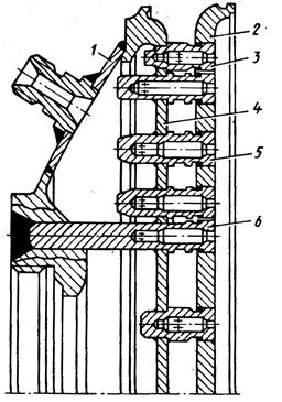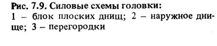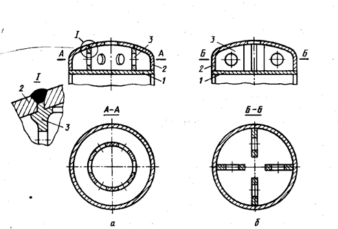 Дня увеличения жесткости и прочности конструкции головки, особенно при большом ее диаметре, часто в наружной полости устанавливаются специальные перегородки-проставки различной формы. Например, в виде цилиндрических колец 3 (рис. 7.9, а) и плоских пластин 3 (рис. 7.9, б). Днища могут соединяться с наружной оболочкой специальными форсунками - штифтами (рис. 7.10). Эти перегородки кроме повышения прочности могут обеспечивать организацию растекания компонента по полости и тем самым создавать однородные условия дня работы форсунок.