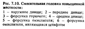 На рис. 7.13 показан фрагмент конструкции головки кислородно-водородного двигателя. с дожиганием генераторного газа и охлаждением части камеры сгорания жидким кислородом. Особенностью головки является использование двухкомпонентных струйно-центробежных форсунок 2. Причем "открытая" центробежная форсунка располагается на пилонах внутри канала струйной.