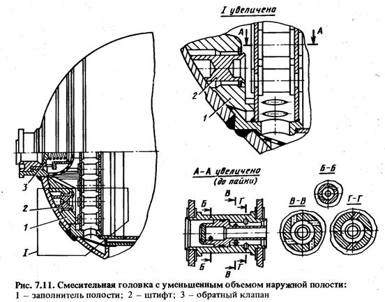 На рис. 7.11 показан вариант конструкции головки, где дня уменьшения импульса последействия сокращен объем наружной полости головки. Это достигнуто его заполнением специальным вкладышем 1, выполненным из алюминиевого сплава и закрепленного на штифтах 2. Для более четкого останова и еще большего снижения времени догорания топлива при останове здесь непосредственно на вводе окислителя установлен обратный клапан 3, отсекающий поступление компонента в полость головки из магистрали после закрытия отсечного клапана.