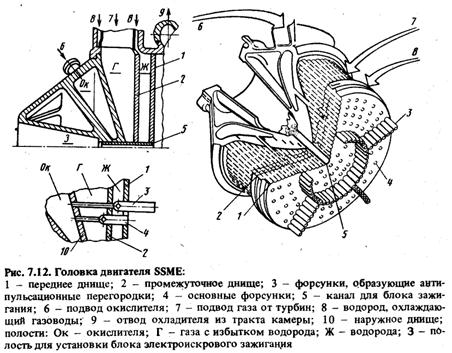 Отработанный на турбине ТНА восстановительный генераторный газ поступает в камеру сгорания через струйный канал форсунок. Газообразный кислород, более "холодный", чем генераторный газ, из тракта· охлаждения камеры сначала поступает в специальную полость головки для охлаждения огневого днища 3, изготовленного из медного сплава, а затем он поступает в основную полость окислителя Ок, из которой кислород по каналам в пилонах направляется в центробежные форсунки.