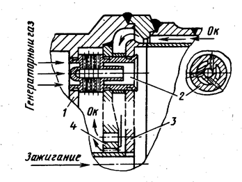 В центре смесительной головки устроен канал, в который с внешней стороны устанавливается блок эпекгроискрового зажигания, от которого в камеру сгорания направляется пусковой факел из форкамеры блока. " .