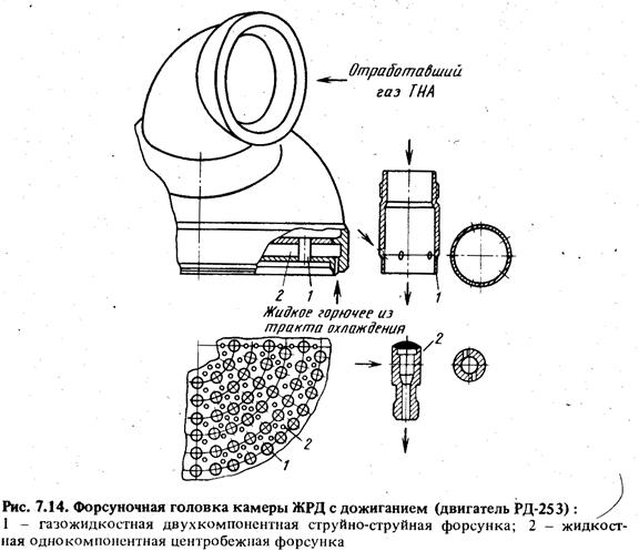 На рис. 7.14 приведена схема конструкций головки и форсунок камеры двигателя РД-253, работающего на компонентах четырехокись азота инесимметричный диметилгидразин по схеме с дожиганием окислительного генераторного газа. Основные форсунки расположены на семи концентрических окружностях равномерно (169 шт.). Для защиты огневого днища между основными форсунками установлены малорасходные форсунки горючего. Конструктивная схема головки сравнительно простая: охлаждающий компонент - горючее - непосредственно из охлаждающего тракта поступает во внутреннюю полость головки, а отработанный на турбине ТНА окислительный генераторный газ по газоводу через установленную в нем решетку для выравнивания по сечению поля полного давления в торец головки.