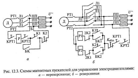 На рис. 12.3, а изображена схема управления электрическим двигателем переменного тока с короткозамкнутым ротором с помощью нереверсивного магнитного пускателя. Эта схема состоит из контактора с тремя главными линейными контактами Л1, одного блок-контакта Б К, служащего для его самоблокировки после срабатывания при нажатии кнопки К1 (Пуск), и двух биметаллических тепловых реле РТ1 и РТ2 для защиты двигателя от перегрузки. Схема работает таким образом. Цепь управления присоединяется к цепи главного тока перед главными контактами пускателя (точки А и Б), в противном случае при отключенном контакторе цепь управления осталась бы без напряжения. При нажатии кнопки К1 (Пуск) образуется цепь: фаза А — контакт теплового реле КРТ1 — втягивающая катушка контактора Р — контакт теплового реле КРТ2 — нажатая кнопка К1 — замкнутая кнопка К2 (Стоп) — фаза Б.