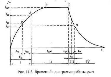 Этап II — работа реле (tраб — время работы реле). После того как реле сработает, ток в обмотке продолжает увеличиваться (участок АВ), пока не достигнет установившегося значения. Участок АВ необходим для того, чтобы обеспечить надежное притяжение якоря к сердечнику, исключающее вибрацию якоря при сотрясениях реле. Впоследствии ток в обмотке реле остается неизменным. Отношение установившегося тока Iуст к току срабатывания Iср называется коэффициентом запаса реле по срабатыванию Kзап, т. е. Kзап показывает надежность работы реле: Kзап = Iуст/Iср = = 1,5...2. Величина Iуст не должна превышать значения, допустимого для обмотки реле по условиям ее нагрева.