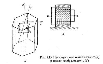 Пьезочувствительный элемент обычно вырезают из кристалла кварца в виде пластины (параллелепипеда), стороны которой параллельны осям кристалла (рис. 5.15, а).