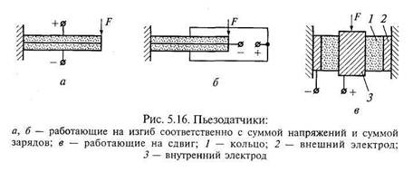 Наряду с преобразователями, в которых пьезоэлемент работает на сжатие-растяжение, применяются конструкции, в которых элемент работает на изгиб и сдвиг Преобразователь, работающий на изгиб, представляет собой две одинаковые пластины, склеенные между собой. Между ними располагается металлическая фольга. При изгибе такого элемента одна пластина удлиняется, а другая укорачивается. В зависимости от схемы подключения обкладок можно получить либо сумму напряжений (см. рис. 5.16, а), либо сумму зарядов (см. рис. 5.16, б). Преобразователь, работающий на сдвиг, представляет собой кольцо из керамики 1 (см. рис. 5.16, в), в которое вклеен внутренний электрод 3 и которое само вклеено во внешний электрод 2. Под действием силы F происходит деформация сдвига плоскостей, параллельных направлению поляризации. Достоинством такого преобразователя является отсутствие зарядов на электродах при боковых воздействиях на датчик.