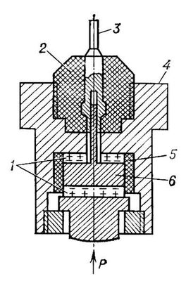 Схема устройства пьезоэлектрического датчика давления: p — измеряемое давление; 1 — пьезопластины; 2 — гайка из диэлектрика; 3 — электрический вывод; 4 — корпус (служащий вторым выводом); 5 — изолятор; 6 — металлический электрод.