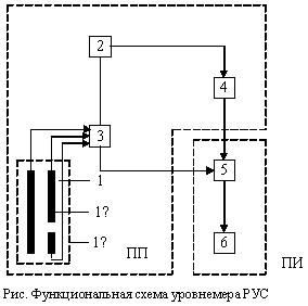 Функциональная схема уровнемера РУС представлена на рис. Первичный преобразователь включает в себя емкостный чувствительный элемент 1 и устройства 2 – 4 преобразования емкости первичного преобразователя в электрический сигнал. Измерительный передающий преобразователь ПИ состоит из усилителя обратной связи 5, усилителя – формирователя 6 унифицированного сигнала. Емкостный чувствительный элемент 1 первичного преобразователя имеет две части: измерительную1′, определяющую предел измерения, и компенсационную 1″, расположенную ниже измерительной и предназначенную для формирования сигнала компенсации ошибки, возникающей от измерения диэлектрических свойств среды. При работе компенсационная часть 1″ должна быть постоянна залита контролируемой жидкостью.