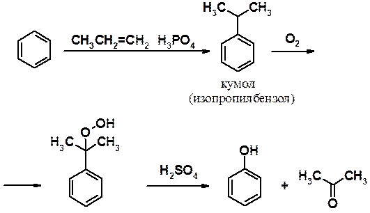 Один из промышленных методов синтеза бензола – кумольный метод – процесс, в котором образуются два промышленно важных и легко разделяемых соединения (фенол и ацетон).