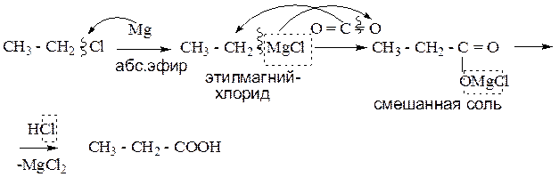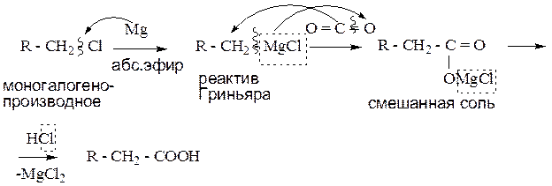 Металлорганические соединения (реактив Гриньяра) – органические соединения, содержание в молекуле атомы магния и галогена. Образуются при действии магния (в абсолютном эфире) на моногалогенопроизводное. При дальнейшем действии на реактив Гриньяра СО2 образуется смешанная соль, которая при разложении минеральной кислотой, образует карбоновую кислоту. Исходное моногалогенопроизводное берется на один атом углерода меньше, чем получаемая кислота.