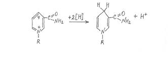 Активной группировкой, участвующей в отщеплении и переносе водорода, служит окисленная форма никотинамида. Исследователи считают, что от субстрата отщепляются два атома водорода в виде гидрид-иона (Нˉ) и протона (Н+), при этом гидрид-ион присоединяется к четвертому углеродному атому никотинамида в составе фермента, переводя его в восстановленную форму, а протон не связывается с коферментом и в дальнейшем непосредственно переходит на акцептор, с которым взаимодействует восстановленный кофермент, передавая на акцептор два электрона и водород в виде гидрид-иона (Нˉ).
