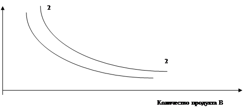 Первоначально потребитель находился в точке 1. Увеличив потребление блага В на ΔВ и оставаясь на прежней кривой безразличия (в точке 2), он сократил потребление блага А на ΔА. Соотношение ΔВ /ΔА, является предельной нормой замещения.