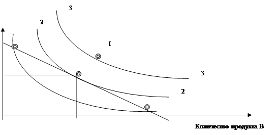 Убедившись в идентичности осей на графиках бюджетных линий и кривых безразличия, мы теперь может определить равновесное состояние потребителя путем совмещения бюджетной линии и карты безразличия. Согласно определению, бюджетная линия показывает комбинации продуктов А и В, доступные для потребителя при данной величине его доходов и при данном уровне цен продуктов. Вопрос заключается в следующем, какая из этих комбинаций наиболее предпочтительна? Ответ очевиден: такая комбинация, которая принесет ему наибольшее удовлетворение, или наибольшую полезность.