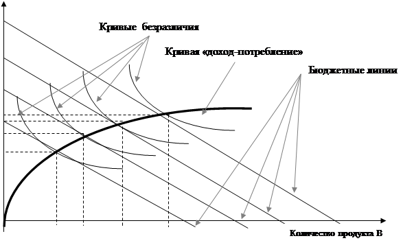 Кривая «доход – потребление» позволяет построить индивидуальную кривую потребления Энгеля, которая показывает зависимость потребления тех или иных групп товаров от изменения доходов.