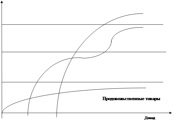 Отложим на оси абсцисс доход потребителя, а на оси ординат – количество оплачиваемых им продуктов. Прежде всего, происходит насыщение потребителя продовольственными товарами, затем – промышленными товарами стандартного качества и лишь позднее – высококачественными товарами и услугами.