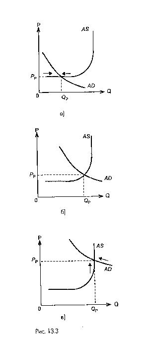 На рис. 13.За пересечение кривых происходит на горизонтальном участке кривой предложения, где движение к равновесному реальному объему национального продукта не сопровождается изменением уровня цен (Р), а вызвано вовлечением в производство неиспользованных ресурсов.